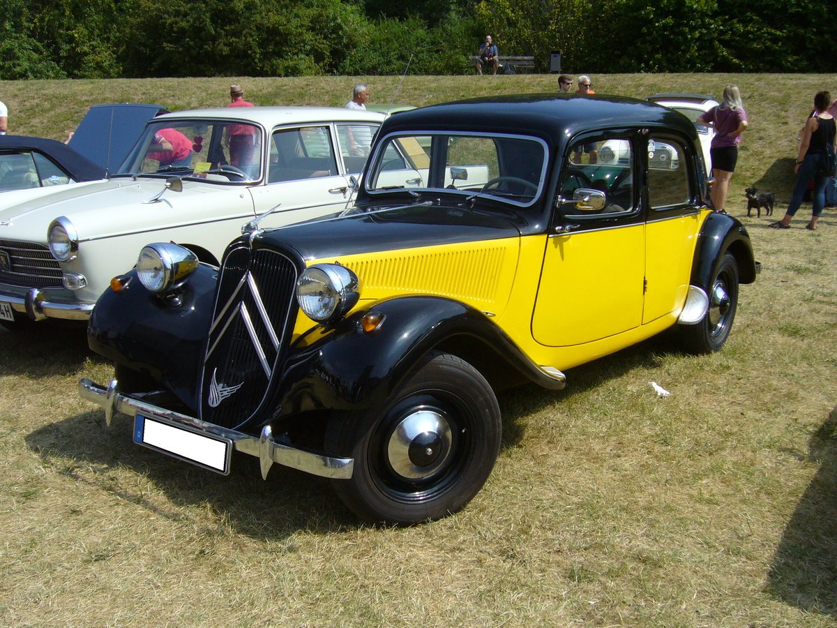 Citroen 11CV BN. Vorgestellt wurde der Traction Avant bereits 1934 auf den Automobilsalons in Paris und Brüssel. Er ist somit ein Vorkriegsmodell, das nach WW2 mit großem Erfolg weiter produziert wurde. Bis zum Produktionsende im Jahr 1957, wurden 759.123 Fahrzeuge dieses Modelles als Limousine, Coupe und Cabriolet produziert. Der Vierzylinderreihenmotor hat einen Hubraum von 1898 cm³ und leistet 60 PS. Der abgelichtete 11CV ist mal nicht in den Einheitsfarbtönen noir oder gris perle lackiert. Oldtimertreffen Zeche Hannover in Herne am 22.07.2018.