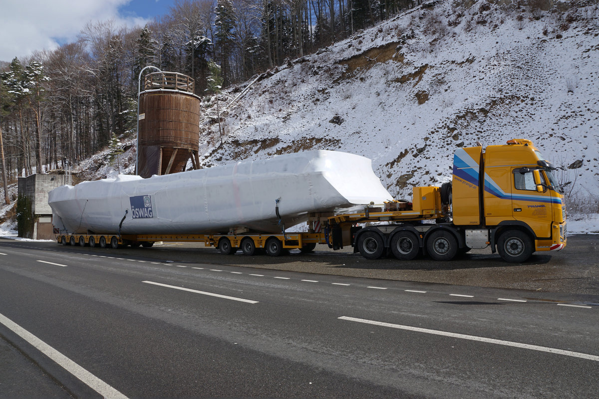 Der Schwertransport während der Ruhepause im verschneiten Langenbruck am 21. März 2018.