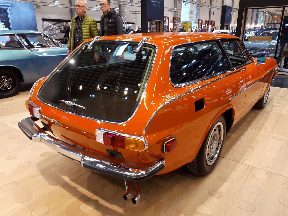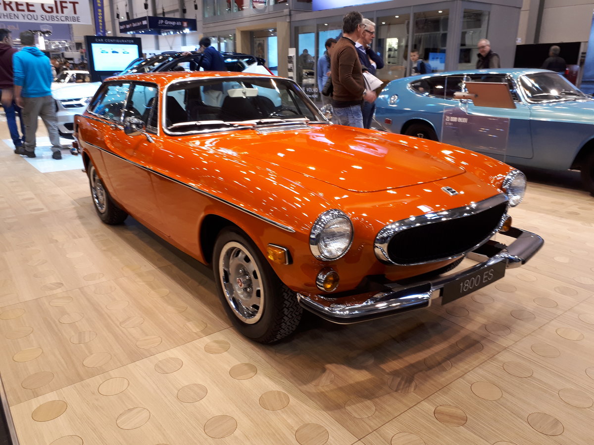 Volvo P1800 ES des Modelljahres 1973. Der im Volksmund auch "Schneewittchensarg" genannte P1800 ES wurde 1971 vorgestellt und bereits 1973 wieder eingestellt. Der abgelichtete Wagen müßte dem Baujahr 1973 entstammen, da der Wagen nur in diesem Modelljahr in der Farbe orange lieferbar war. Der 4-Zylinderreihenmotor hat einen Hubraum von 1986 cm³ und leistet 124 PS. Techno Classica Essen am 24.03.2018.