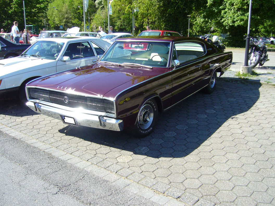 Dodge Charger des Modelljahres 1966/1967. Der Kunde konnte zwischen vier V8-motorisierungen wählen: 5211 cm³ und 230 PS, 6276 cm³ und 325 PS, 6980 cm³ und 425 PS, sowie dem neuen HEMI 440 Magnum Motor mit 7210 cm³ und 375 PS. An der Westküste der USA war ein solcher Charger ab US$ 3482,00 zu haben. Prinz-Friedrich Oldtimertreffen am 06.05.2018 in Essen-Kuperdreh.