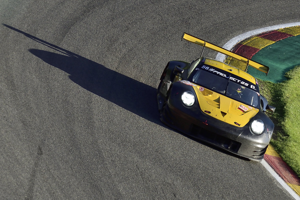 Mitzieher LM GTE Nr.56 AM, Project 1 Motorsport, Porsche 911 RSR, Jörg Bergmeister, Patrick Lindsey & Egidio Perfetti. Langstrecken-WM (FIA WEC) – Sechs Stunden von Spa-Francorchamps 5.Mai 2018.