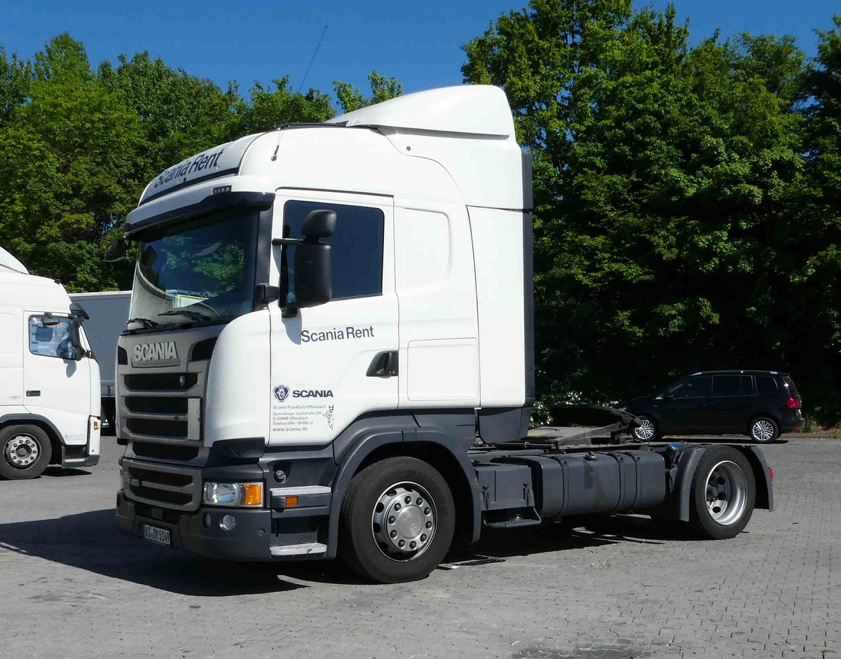 =Scania-Sattelzugmaschine von Scania-Rent steht auf dem Rasthof Fulda-Nord im Mai 2018