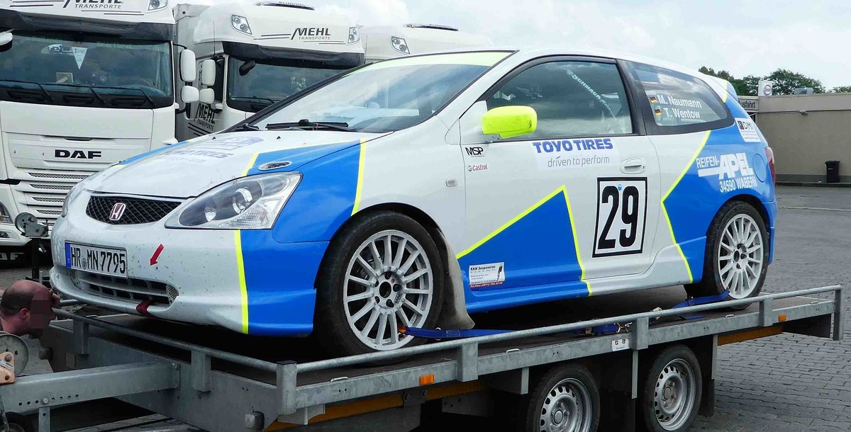 =Honda Civic, Teilnehmerfahrzeug der Rallye Fränkisches Weinland 2018, gesehen auf dem Rasthof Fulda Nord im Mai 2018