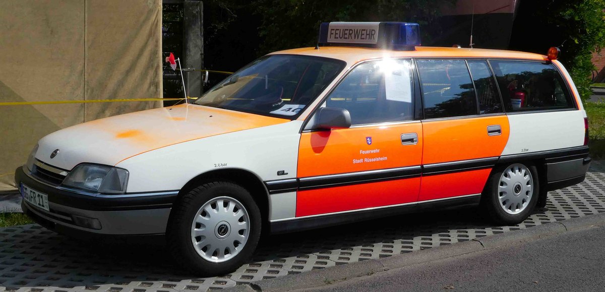 =Opel Omega A als ehemaliges Einsatzfahrzeug der Feuerwehr Rüsselsheim, ausgestellt beim "Roten Sommer" 2018 in Fulda. Die zweitägige Veranstaltung "Roter Sommer" erinnert an die Bedeutung der vielen Hilfsorganisationen. Mai 2018
