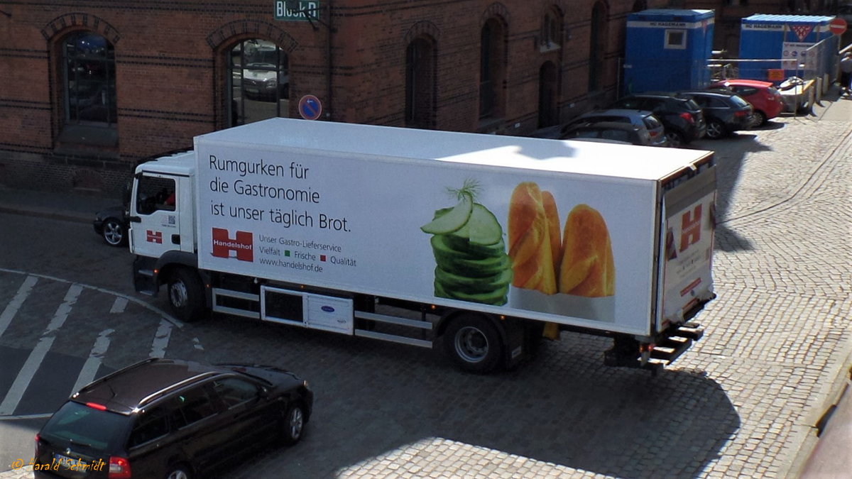 3210 Hamburg am 15.5.2018: MAN Koffer-Lkw mit einer besonderen Werbung /