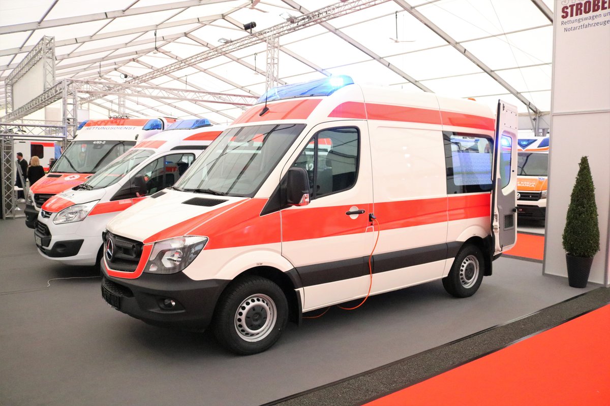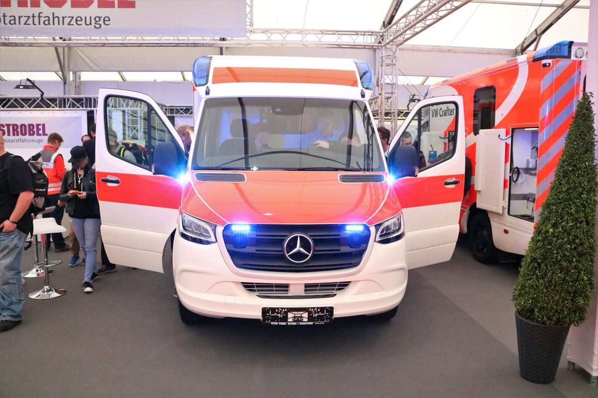 Der neue Mercedes Benz Sprinter mit System Strobel RTW Aufbau am 18.05.18 auf der RettMobil in Fulda