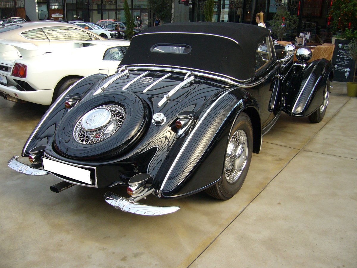Heckansicht eines Horch 855 Spezialrodster mit einer Karosserie von Gläser/Dresden. Classic Remise Düsseldorf am 26.05.2018.