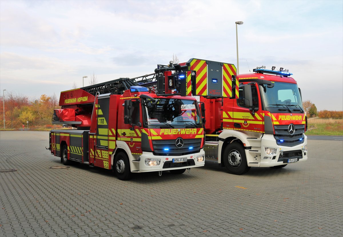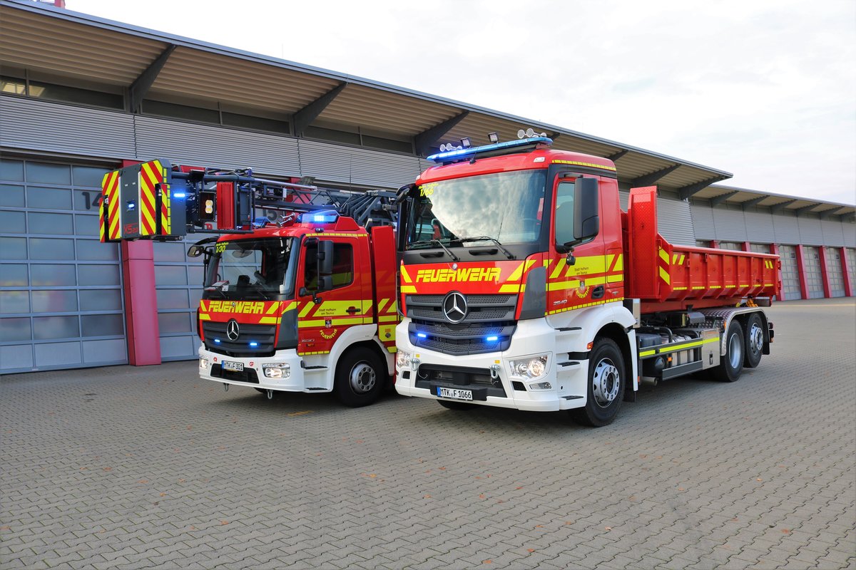 Feuerwehr Hofheim Taunus Mercedes Benz Arocs WLF (Florian Hofheim 1-66) mit AB Mulde und Mercedes Benz Atego DLA(K)23/12 (Florian Hofheim 1-30) am 09.11.18 bei einen Fototermin