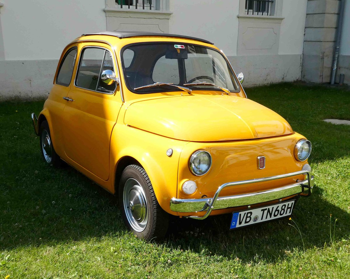 =Fiat 500, steht bei Blech & Barock im Juli 2018 auf dem Gelände von Schloß Fasanerie bei Eichenzell