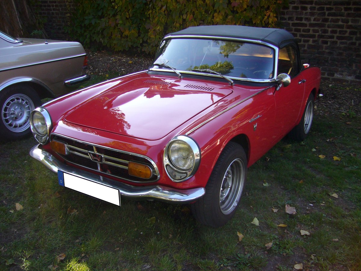 Honda S 800 Cabriolet. 1967-1971. Der S 800 wurde auf dem Pariser Salon 1966 vorgestellt und stand ab Frühjahr 1967 bei den Händlern. Der Vierzylinderreihenmotor hat einen Hubraum von 791 cm³ und leistet 70 PS. In Deutschland war das Cabriolet nur in den drei Farben rot, weiß und gelb erhältlich. Oldtimertreffen an der Niebu(h)rg in Oberhausen am 07.10.2018.