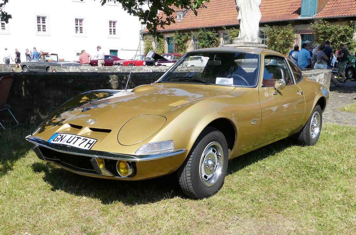 =Opel GT, Erstzulassung 1971, unrestauriert, steht bei Blech & Barock im Juli 2018 auf dem Gelände von Schloß Fasanerie bei Eichenzell