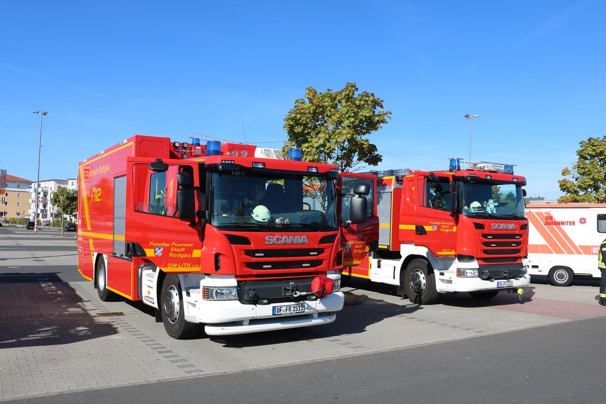 Feuerwehr Rodgau Süd Scania GW-L (Florian Rodgau 1-51-1) und Scania TLF4000 (Florian Rodgau 1-24-1) am 16.09.18 bei einer Katastrophenschutzübung in Rödermark Urberach