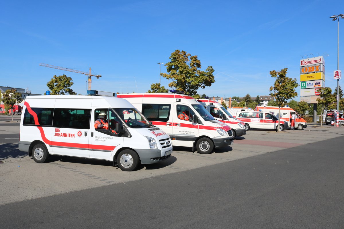 Mehrere Die Johanniter RTW des Katastrophenschutz am 16.09.18 bei einer Katastrophenschutzübung in Rödermark Urberach
