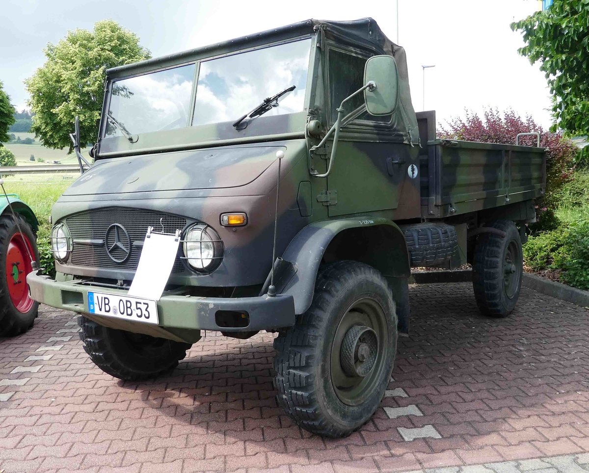 =Unimog steht bei der Traktorenausstellung "Ahle Bulldogge us Angeschbach oh Lannehuse" in Angersbach im Juni 2018
