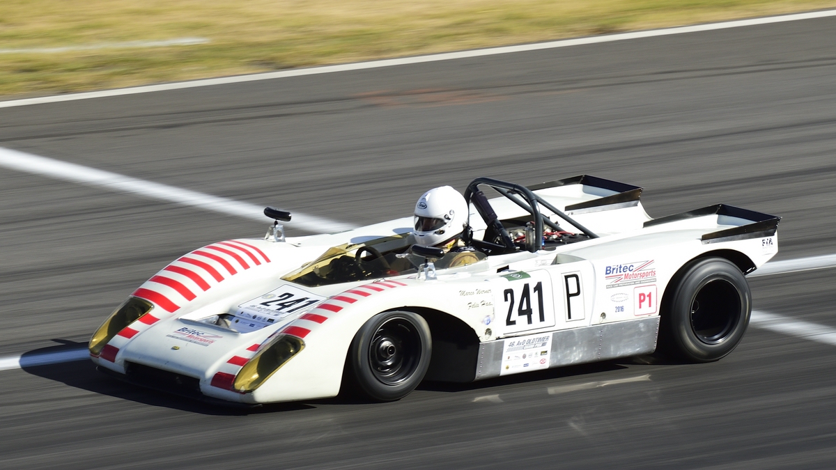 Mitzieher #5 Lamberty, Rolf E.M. im Chevron B16, ccm 2000, Bj. 1970. FIA Masters Historic Sports Car Championship (eine Serie für Sportwagen im Le Mans-Stil und Fahrzeuge der Gruppe 4 von 1962 bis 1974. 46. AvD-Oldtimer-Grand-Prix 2018, FIA Masters Historic Formula One Championship am 11.Aug.2018