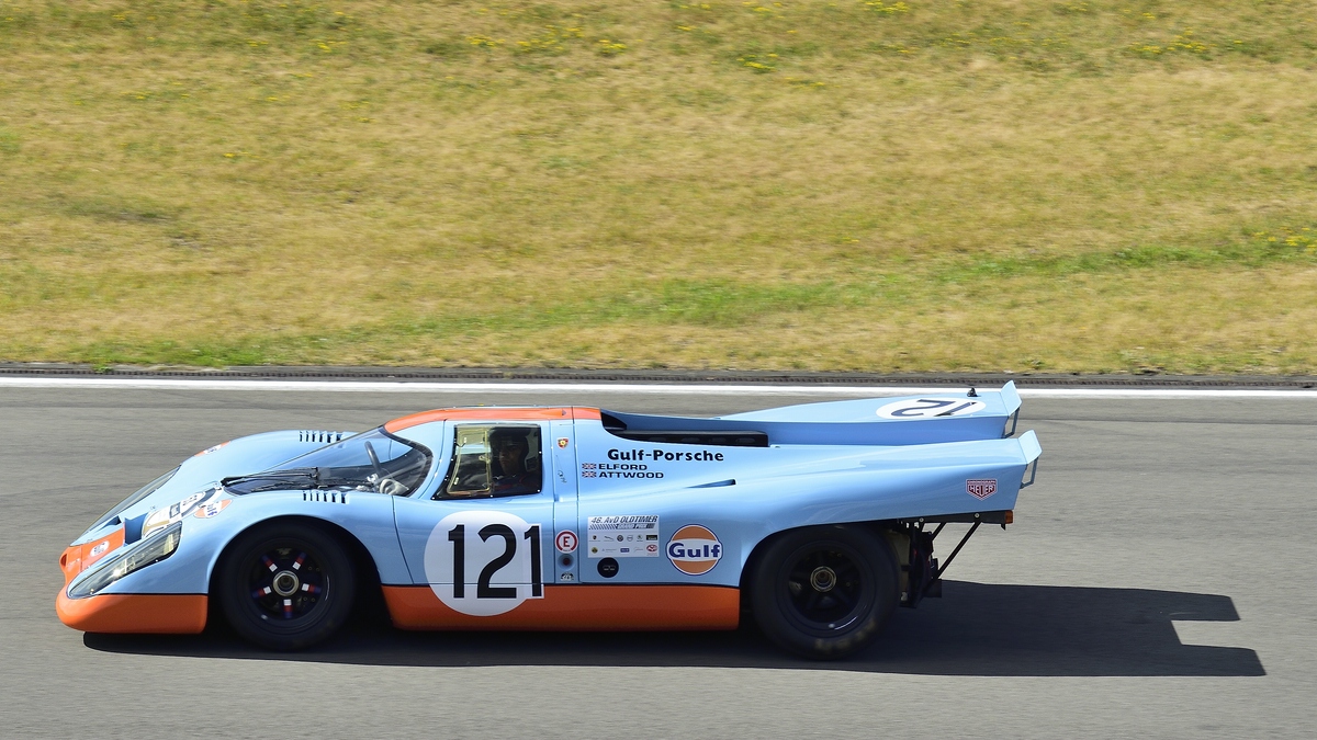 Mitzieher des Porsche 917K. FIA Masters Historic Sports Car Championship (eine Serie für Sportwagen im Le Mans-Stil und Fahrzeuge der Gruppe 4 von 1962 bis 1974. 46. AvD-Oldtimer-Grand-Prix 2018, FIA Masters Historic Formula One Championship am 11.Aug.2018