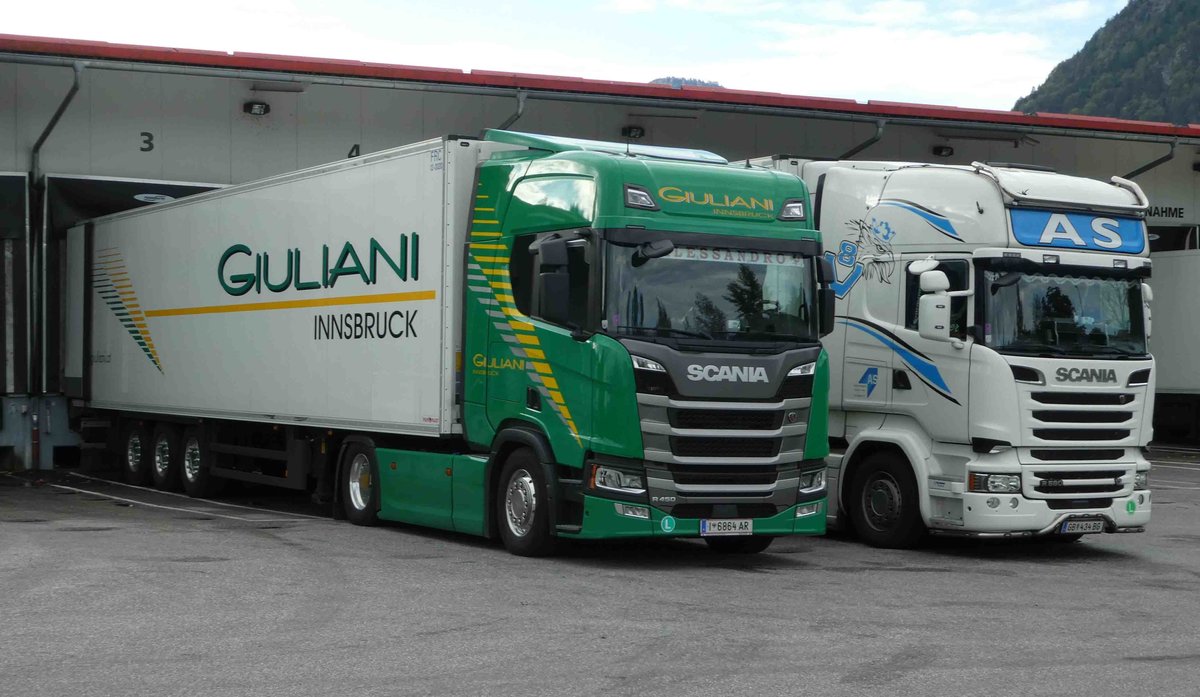 =Scania-Sattelzüge stehen zur Be- und Entladung in Piding, 09-2018