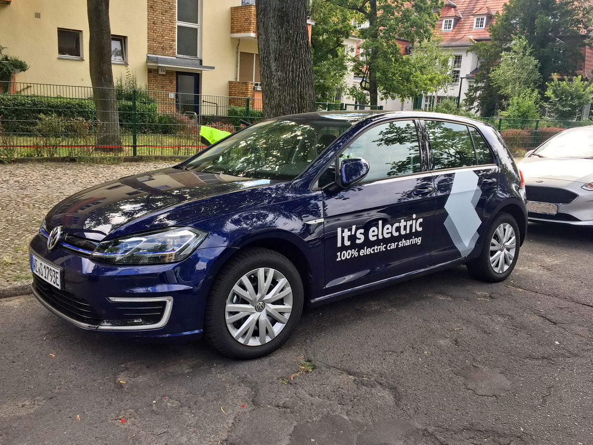 E-Golf, von z.Zt. 1500 Einheiten, des VW-Carsharing Anbieters We Share in Berlin. Die Daten des Auto: Motor, Elektro; Leistung 100kW/136PS bei 3000U/min; 1-Gang-Automatikgetriebe. Vmax 150km/h. Foto: 14.08.2019