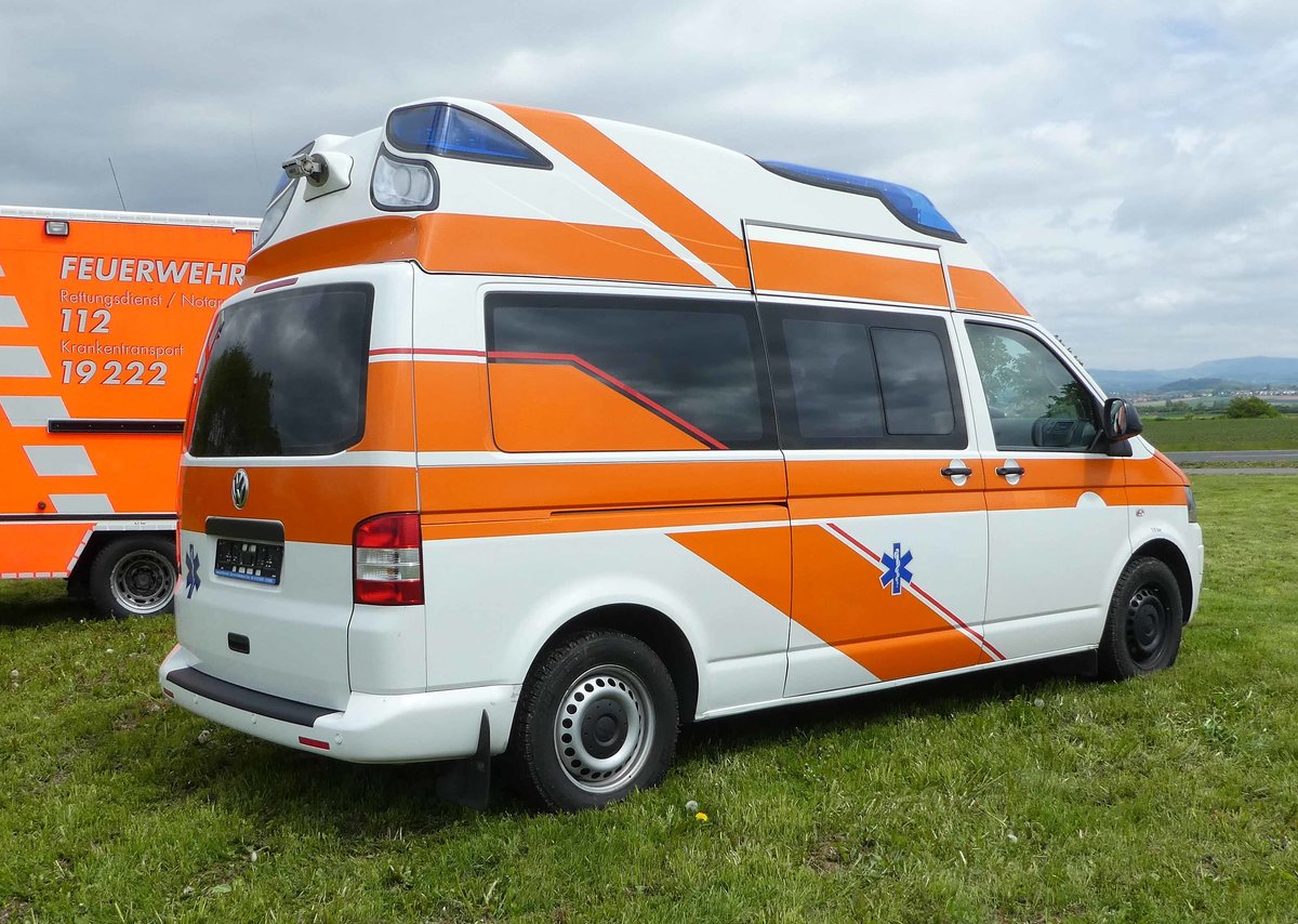 =VW T5 vom DRK Bereitschaft OBERKOCHEN, steht auf dem Parkplatz der Rettmobil 2019 in Fulda, 05-2019