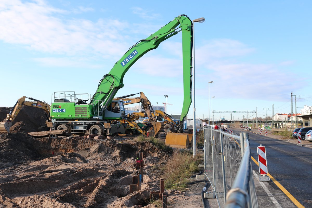 Sennebogen 850E am 21.12.19 in Heidelberg über den Bauzaun fotografiert