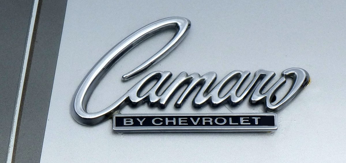 Chevrolet Camaro, Schriftzug auf der Motorhaube des US-amerikanischen Sportwagens, Baujahr 1967, Juli 2017