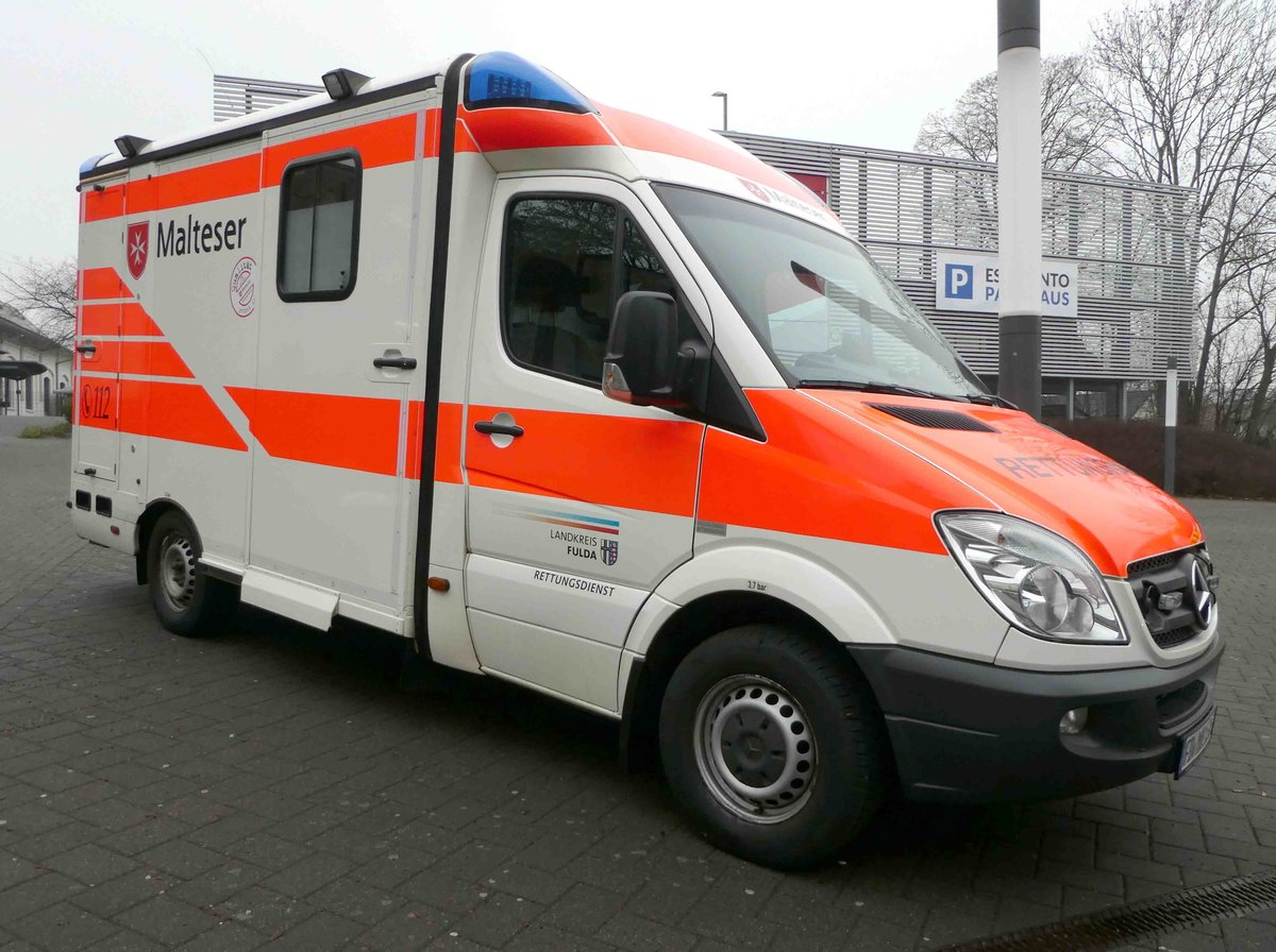 =MB Sprinter der Malteser steht auf der Präsentationsfläche des Hotels Esperanto anl. des Osthessischen Gesundheitstages in Fulda, 02-2019