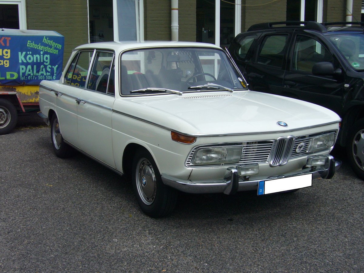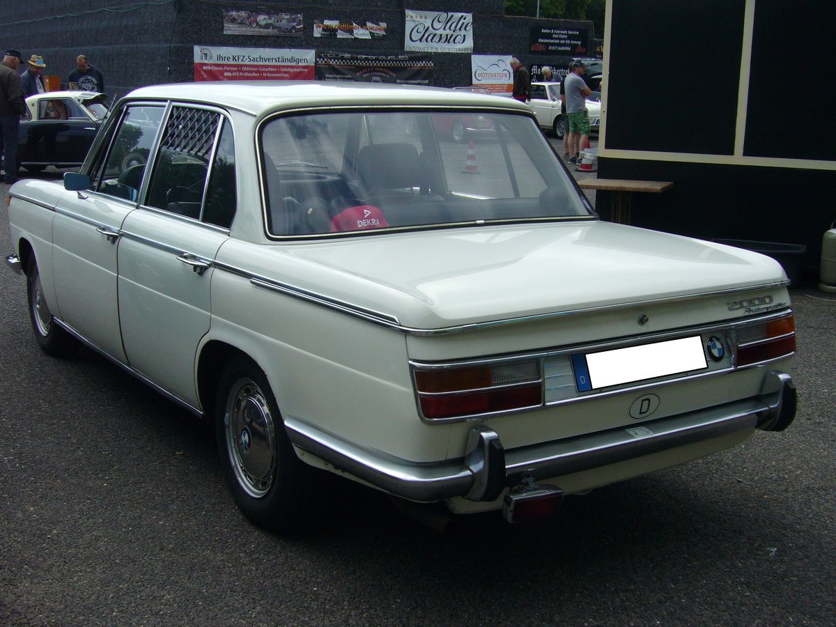 BMW 2000 Automatic, gebaut von 1966 bis 1972. Der 2000 war bezüglich seines Hubraumes das Spitzenmodell der sogenannten "Neuen Klasse". Der 100 PS leistende Vierzylinderreihenmotor mit einem Hubraum von 1.990 cm³ verhalf dem Auto zu einer Spitzengeschwindigkeit von 168 km/h. Bei seiner Markteinführung kostete ein solcher Wagen DM 11.475,00 in Grundausstattung. Kleinwagentreffen an Mo´s Bikertreff in Krefeld am 20.06.2019.