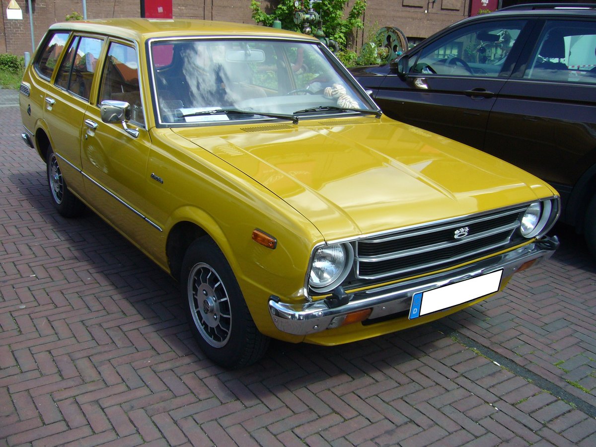 Toyota Corolla der dritten Serie als Kombi (Modell KE36), gebaut von 1974 bis 1979. Deutlich europäischer als seine Konkurrenten aus Japan, gab sich die dritte Corolla-Generation, die im Frühjahr 1975 zu den Händlern rollten. Der Corolla war wahlweise mit zwei Vierzylinderreihenmotoren lieferbar: 1166 cm³ Hubraum mit 55 PS oder einem Hubraum von 1588 cm³ mit wahlweise 73 PS oder 84 PS. Der abgelichtete Corolla wurde im Januar 1978 erstmals zugelassen. Youngtimertreffen Zeche Ewald in Herten am 12.05.2019.