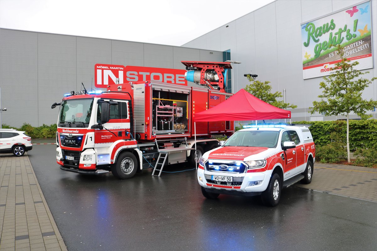 EVONIK Werkfeuerwehr Worms MAN TGS WLF mit Abrollbehälter Turbolöscher und Ford Ranger VRW am 11.05.19 beim Tag der Retter in Mainz