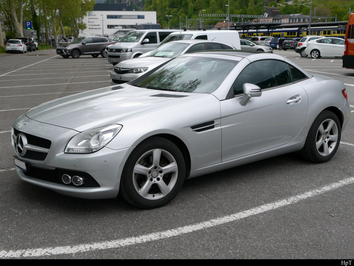 Silber / Grauer Mercedes SLK 200 auf Parkplatz in Interlaken am 13.05.2019