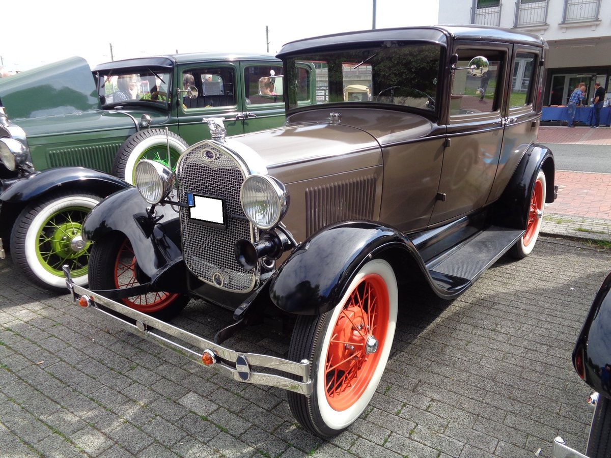 Ford Model A Fordoor Sedan, produziert von 1928 bis 1931. Das in etlichen Karosserieversionen erhältliche Model A war nach dem Model T, das zweite Erfolgsauto der Mannen aus Dearborn. Es wurden über 4.3 Millionen Model A produziert. Hier haben wir eine viertürige Limousine aus dem Jahr 1928 im Farbton manila brown. Der Vierzylinderreihenmotor hat einen Hubraum von 3285 cm³ und leistet 40 PS. Die Höchstgeschwindigkeit lag bei ca. 100 km/h. 18. Prinz Friedrich Oldtimertreffen am 26.05.2019 in Essen-Kupferdreh.