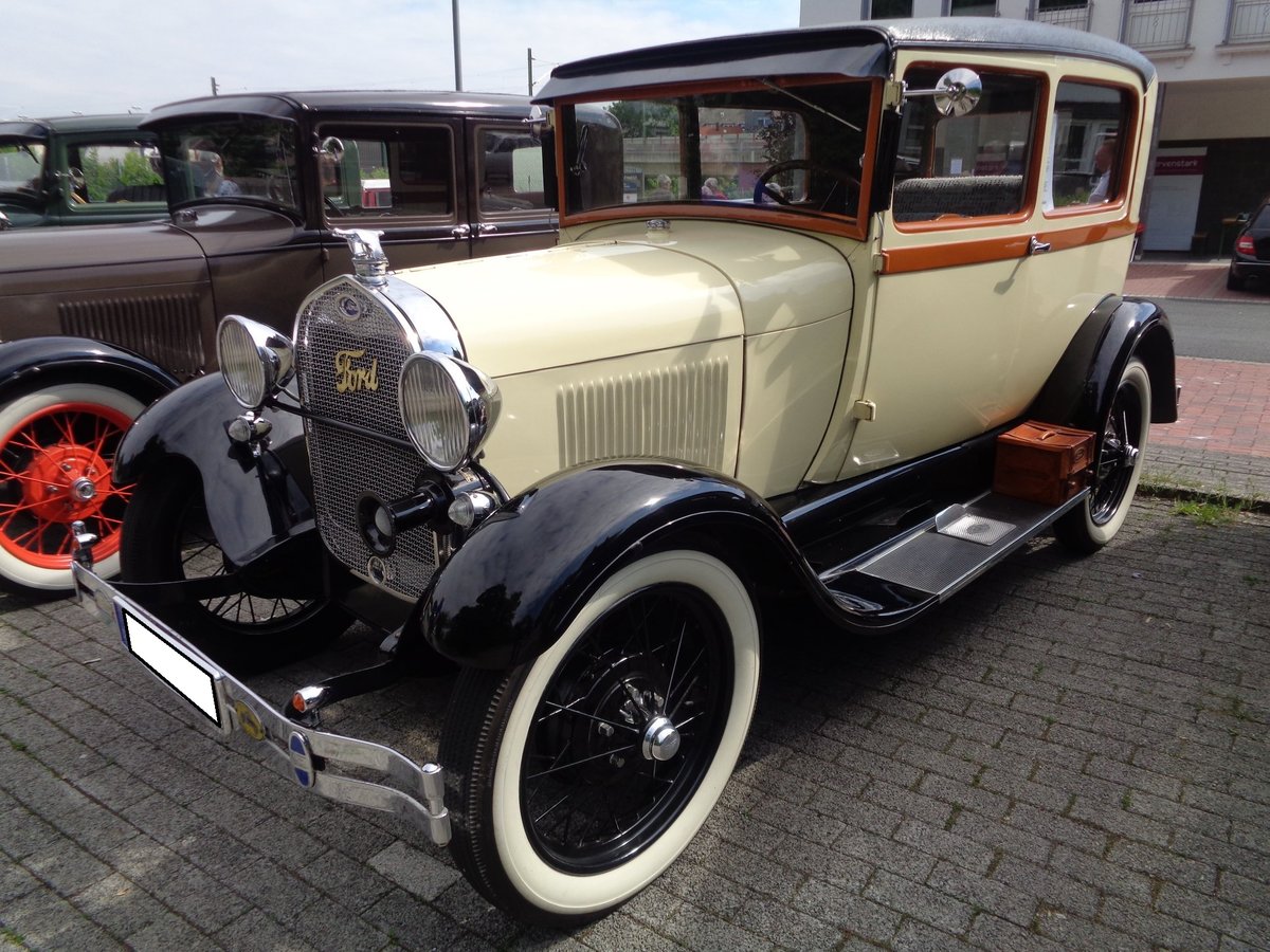Ford Model A Tudor, gebaut von 1928 bis 1931. Das Model A war der Nachfolger des legendären Ford Model T. Während der vierjährigen Produktionszeit wurden 4.320.446 Einheiten in etlichen Karosserievarianten produziert. Der abgelichtete Karosserietyp Tudor im Farbton straw wurde lief im ersten Modelljahr, 1928, vom Band. Der Vierzylinderreihenmotor hat einen Hubraum von 3285 cm³ und leistet 40 PS. 18. Prinz Friedrich Oldtimertreffen am 26.05.2019 in Essen-Kupferdreh.