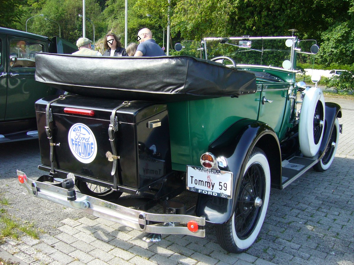 Heckansicht eines Ford Model A Phaeton, produziert von 1928 bis 1931. Während seiner vierjährigen Produktionszeit verkaufte sich dieses Modell über 4.3 Millionen mal. Der abgelichtete Wagen stammt aus dem zweiten Produktionsjahr 1929. Der Vierzylinderreihenmotor hat einen Hubraum von 3285 cm³ und leistet 40 PS. Der offene Viersitzer erreicht mit dieser Motorleistung eine Höchstgeschwindigkeit von ca. 95 km/h. 18. Prinz Friedrich Oldtimertreffen am 26.05.2019 in Essen-Kupferdreh.