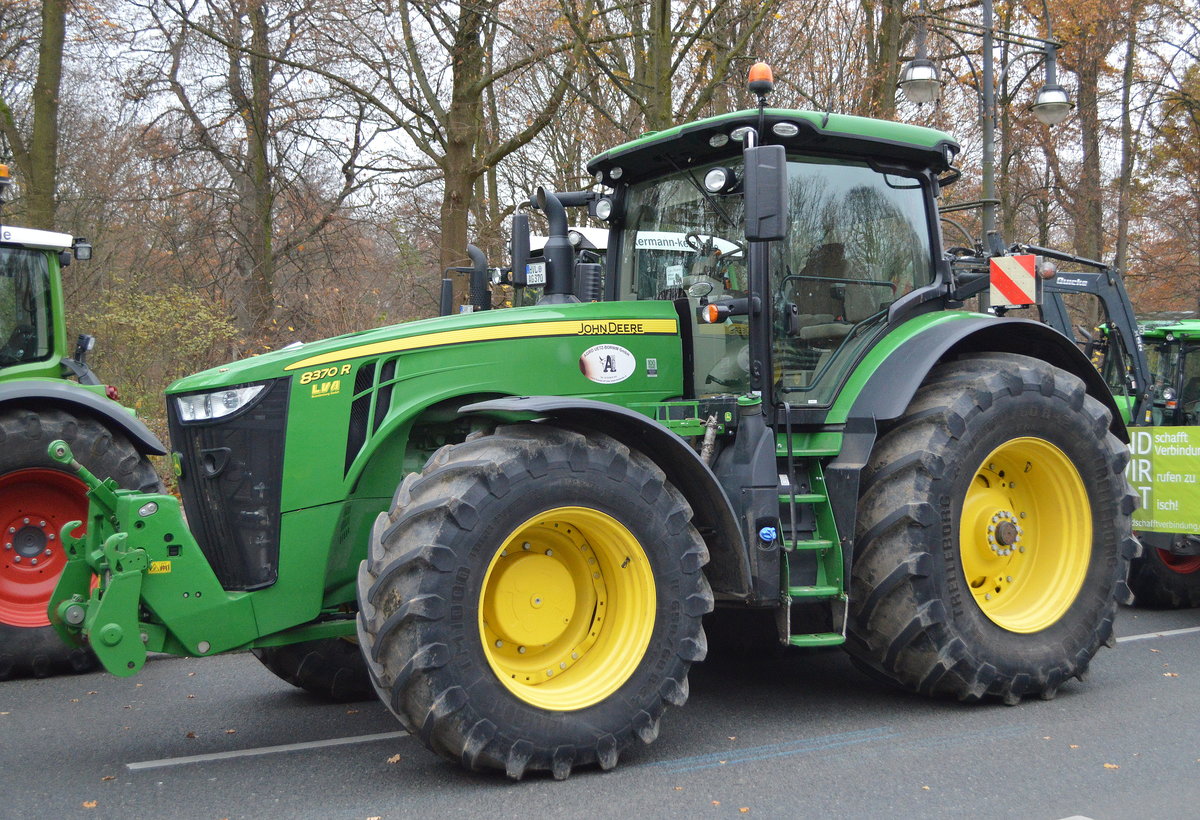 Gewaltige Maschine mit verlängerter Front, ein JOHN DEERE 8370 R Traktor am 26.11.19 Straße des 17 Juni Berlin.