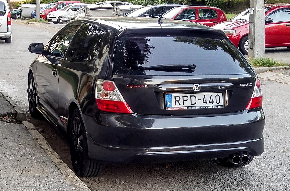 Rückansicht: Honda Civic Mk7, fotografiert in Pécs (Ungarn) in August 2019.