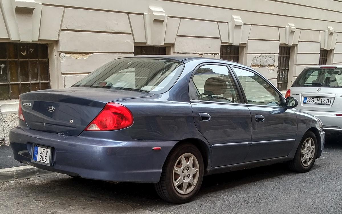 Rückansicht: Kia Spectra (US Modell), fotografiert in Pécs (Ungarn) in August 2019.