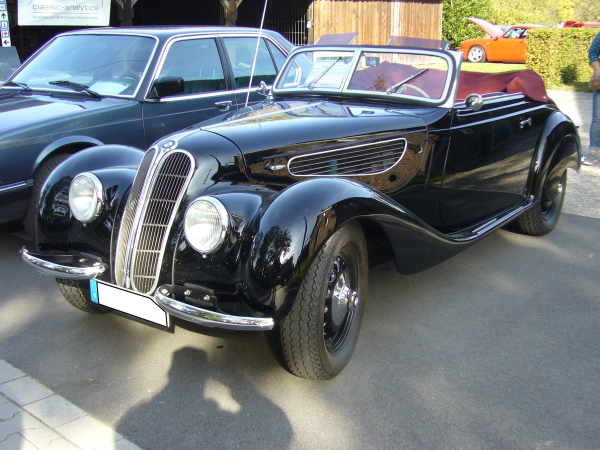 BMW 327/328 Cabriolet, produziert von 1937 bis 1941. Bei diesem Sportzweisitzer handelt es sich um einen BMW 327, der mit dem Sechszylinderreihenmotor des BMW 328 lieferbar war. Dieser Motor hatte einen Hubraum von 1.971 cm³ und leistete 80 PS. Der Preis belief sich auf 8.130,00 Reichsmark. Der abgelichtete Wagen wurde 1939 ausgeliefert. Oldtimertreffen des Oldtimerclubs Schermbeck am 22.09.2019 in Lühlerheim.