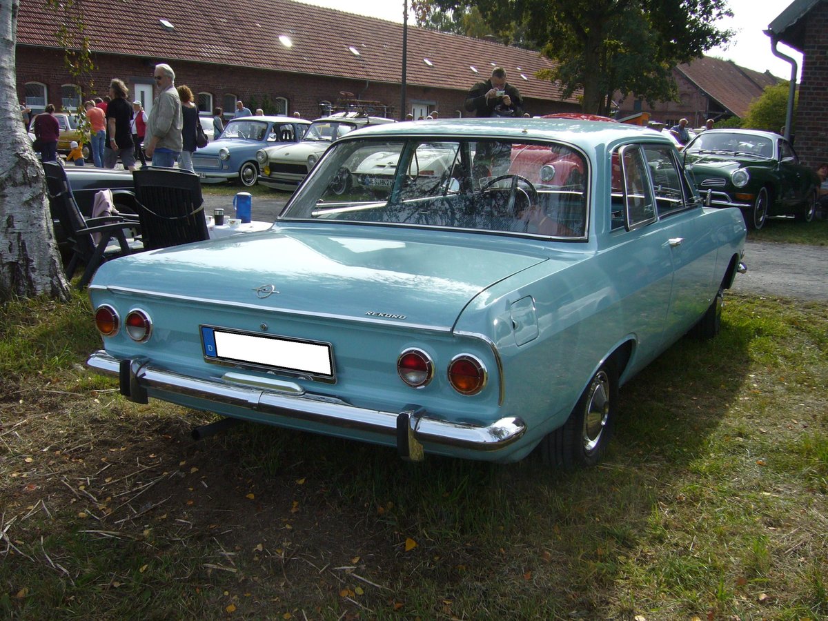 Heckansicht einer 1966´er Opel Rekord B Limousine im Farbton horizontblau. Oldtimertreffen des Oldtimerclubs Schermbeck am 22.09.2019 in Lühlerheim.