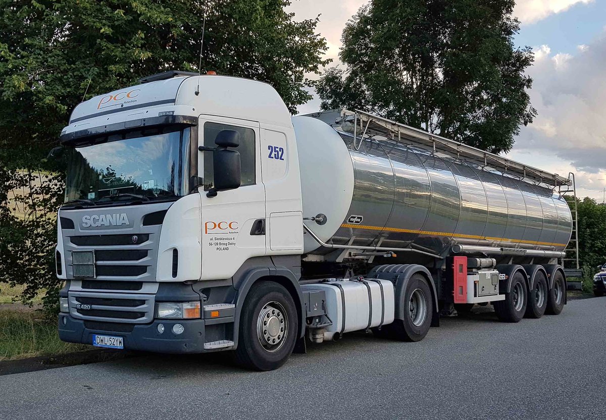 =Scania R420-Sattelzug von PCC steht im Juli 2020 auf einem Rastplatz an der A 66
