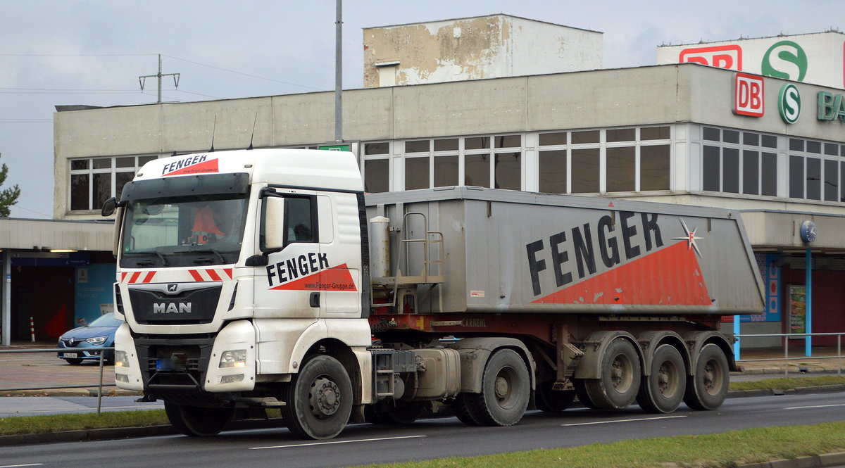 Fenger Beton und Kies GmbH & Co KG (Fenger-Gruppe) mit einem MAN Sattelkipper am 16.12.20 Schönefeld b. Berlin.