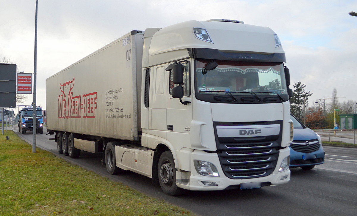 Polnischer Sattelzug der Fa. Mckeen-Beef mit DAF XF 510 EURO 6 Zugmaschine am 16.12.20 Schönefeld b. Berlin.