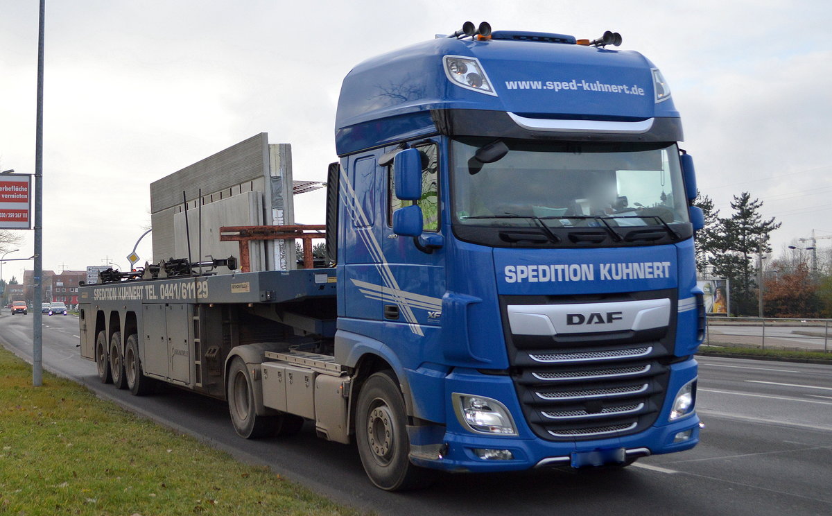 Spedition Kuhnert mit einem Sattelzug mit DAF XF 480 Zugmaschine mit Auflieger für Betonfertigteile für den Hausbau am 16.12.20 Schönefeld b. Berlin.