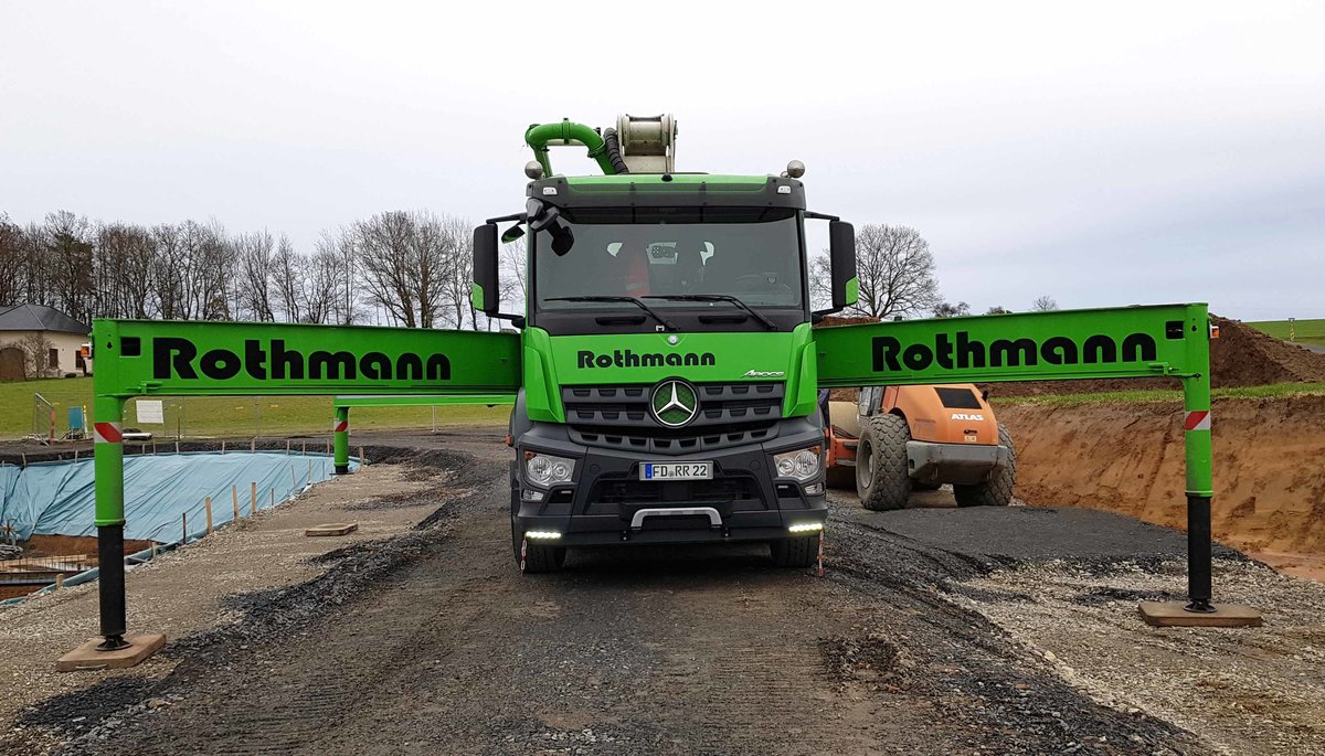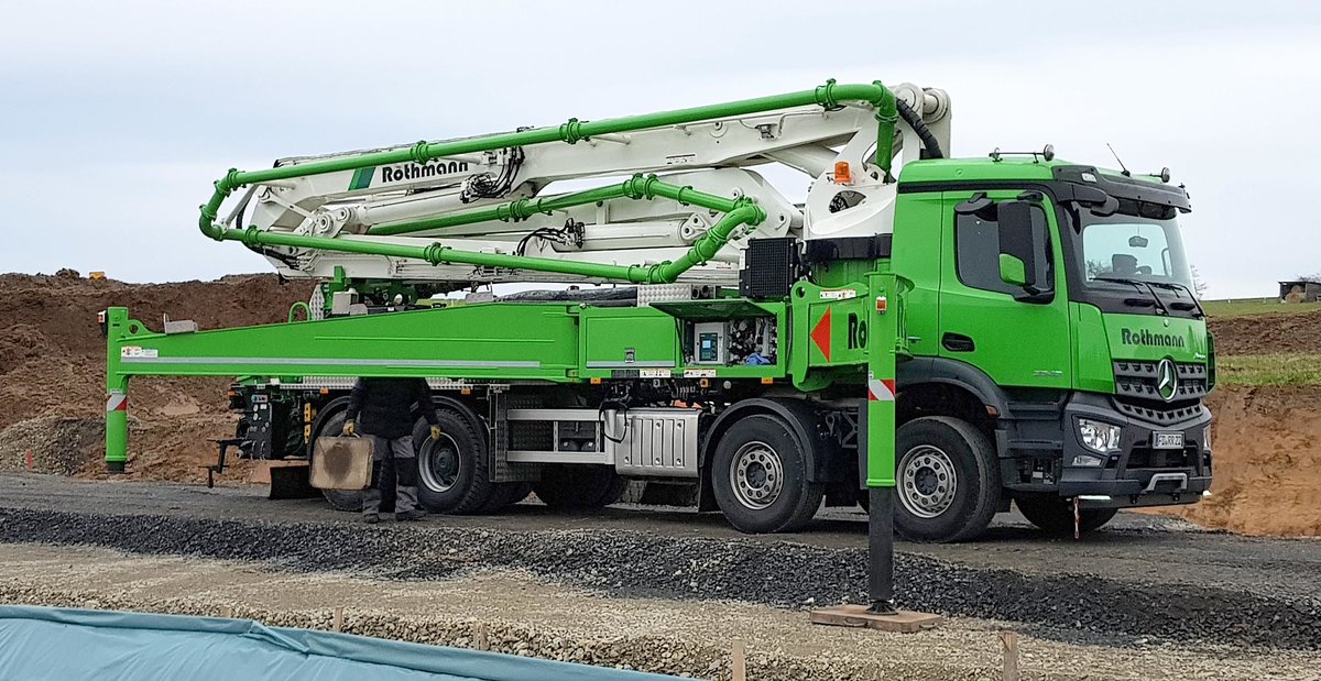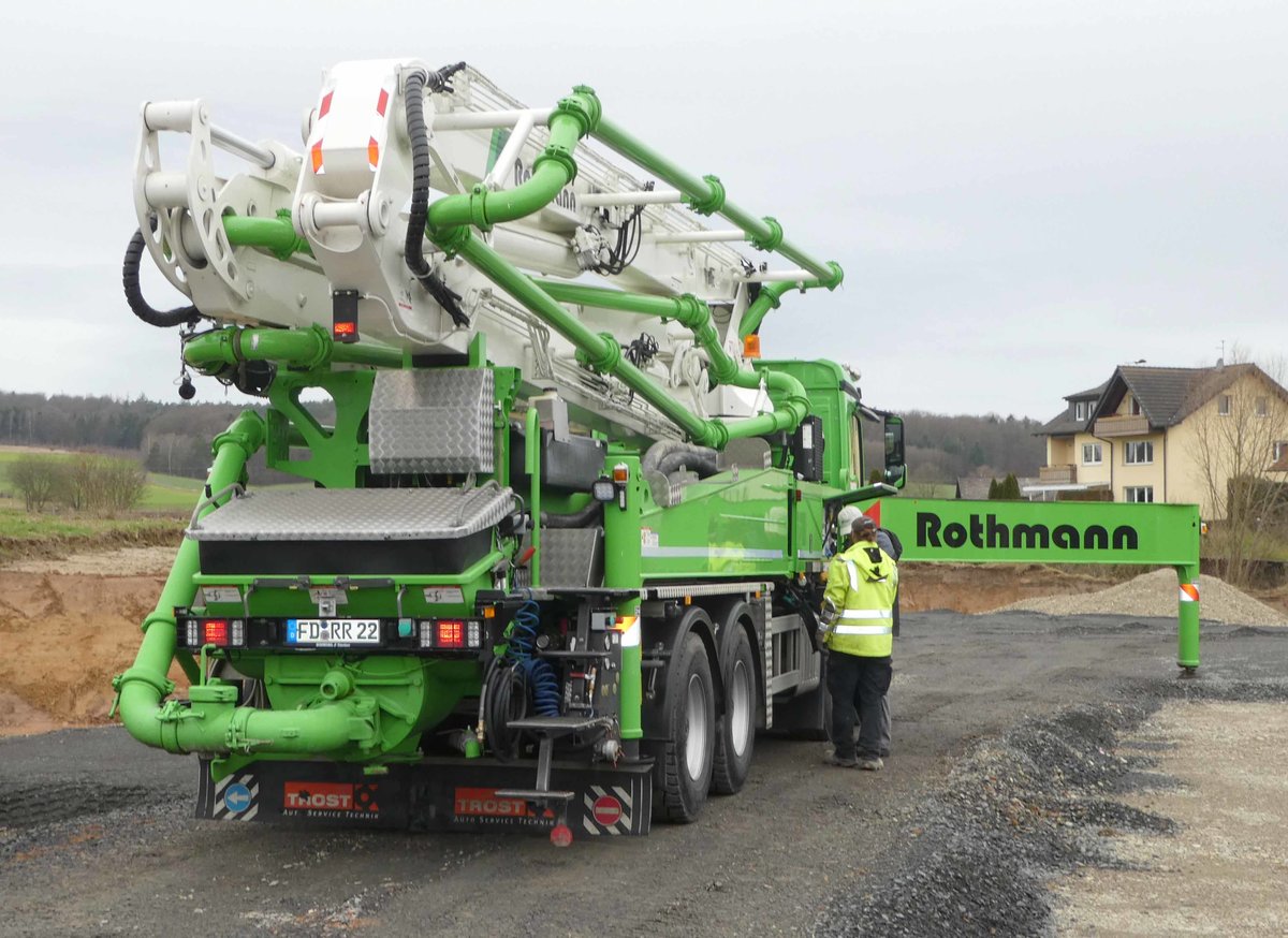 =MB Arocs-Betonpumpenfahrzeug der Firma ROTHMANN wird für den nächsten Auftrag eingerichtet, 12-2019