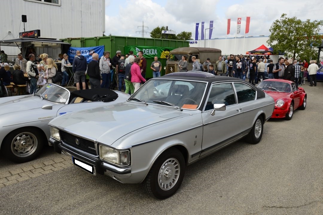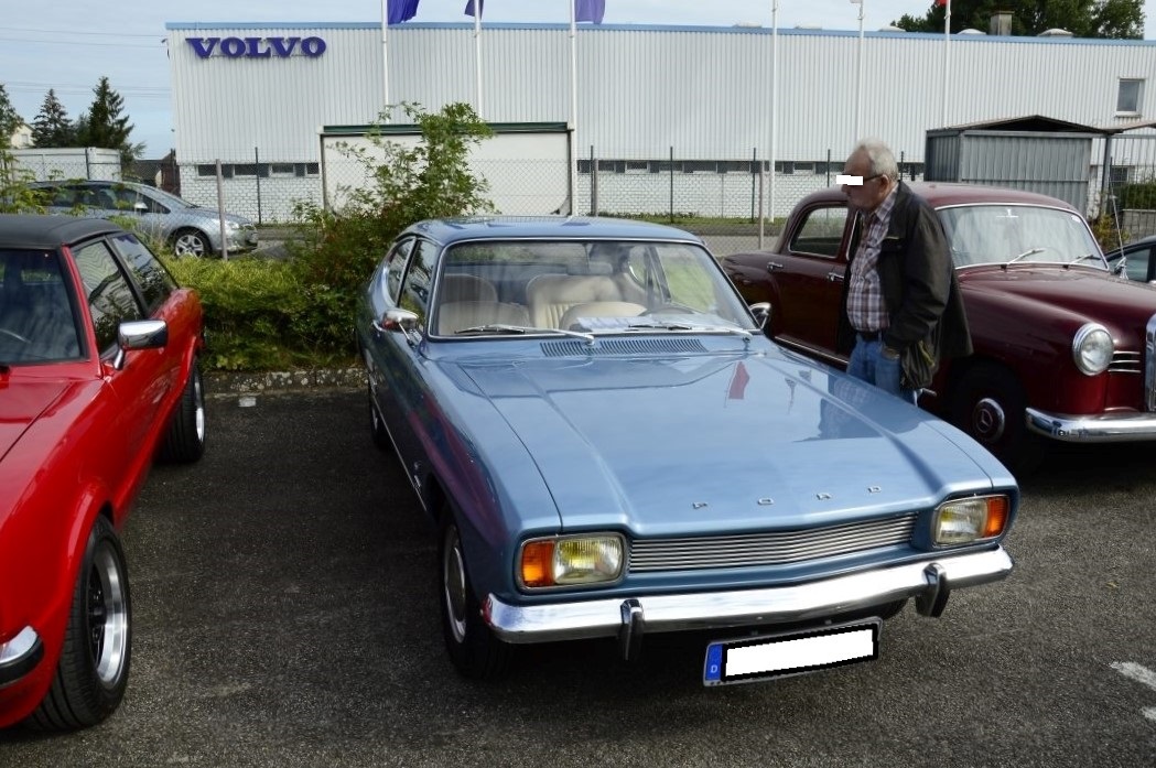 Ford Capri 1, gebaut von 1969 bis 1973. Der Capri 1 wurde von den deutschen und englischen Ford-Werken gemeinsam entwickelt und im Januar 1969 vorgestellt. Das Modell bewirkte einen Wiederanstieg der Verkaufszahlen von Ford. Der Capri war mit einer breit gefächerten Motorenauswahl bestellbar. Der abgelichtete Capri ist ein 1500 in der Ausstattungsvariante XL. Der 1500 war die zweit niedrigste Motorisierungsstufe. Der V4-Motor hat einen Hubraum von 1498 cm³ und leistet 60 PS. Das verhilft dem Wagen zu einer Höchstgeschwindigkeit von 142 km/h. Ein solcher Capri stand bei seiner Markteinführung mit einem Basispreis von DM 7300,00 in der Preisliste. Oldtimertreffen der Oldtimerfreunde Moers im August 2017 beim Autohaus Pannenbecker.