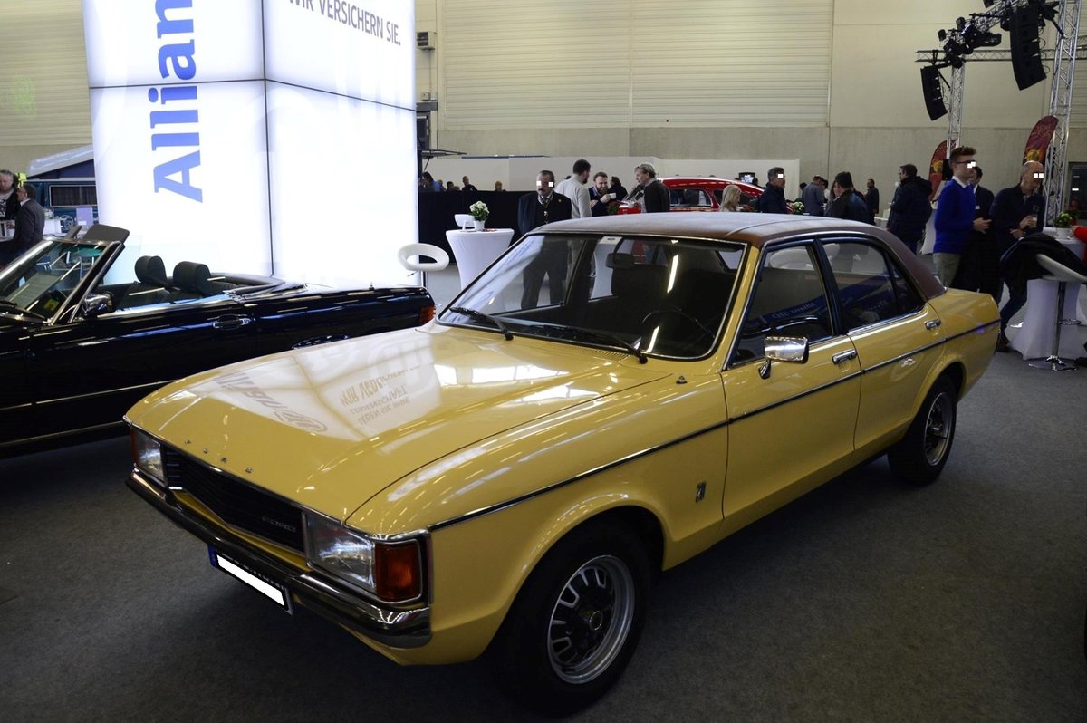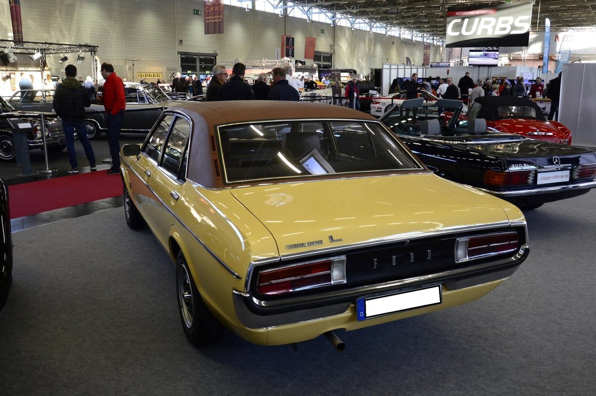 Ford Granada MK1 Limousine, gebaut von 1972 bis 1977. Der Granada und das Schwestermodell Consul wurden auf den Genfer Salon des Jahres 1972 vorgestellt. Sie waren das Nachfolgemodell der Baureihe P7b. Produziert wurde das Modell in Köln-Niehl und in Dagenham/GB. Der abgelichtete, viertürige Granada trägt eine Lackierung mit der Farbbezeichnung sahara. Zusätzlich ist er ist mit einem zeitgenössischen braunen Vinyldach ausgerüstet. Motorisiert ist der Granada mit einem V6-Motor , der aus 1981 cm³ Hubraum 90 PS leistet. Retro Classic Cologne im November 2018.