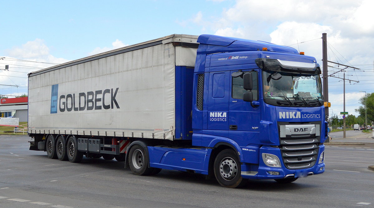 Die tschechische Sped. NIKA LOGISTICS a.s. mit Aufliegerder Firmengruppe GOLDBECK mit DAF XF 480 Zugmaschine am 29.07.20 Berlin Marzahn.