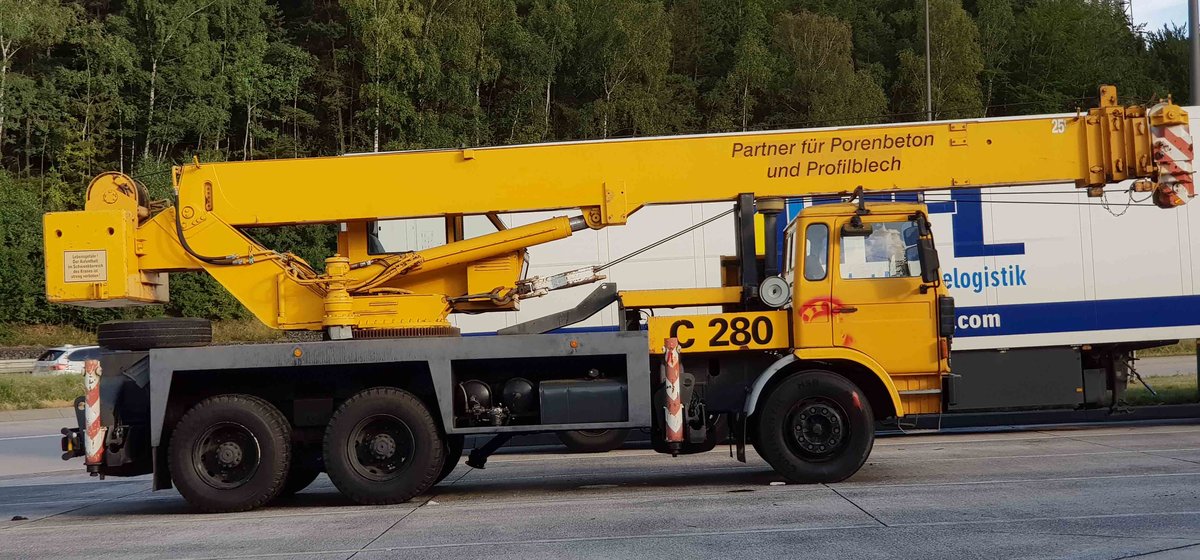 =Magirus Deutz mit einem PPM C280 Kran steht im Juli 2020 an der A 7. PPM war ein französischer Kran- und Baumaschinenhersteller.