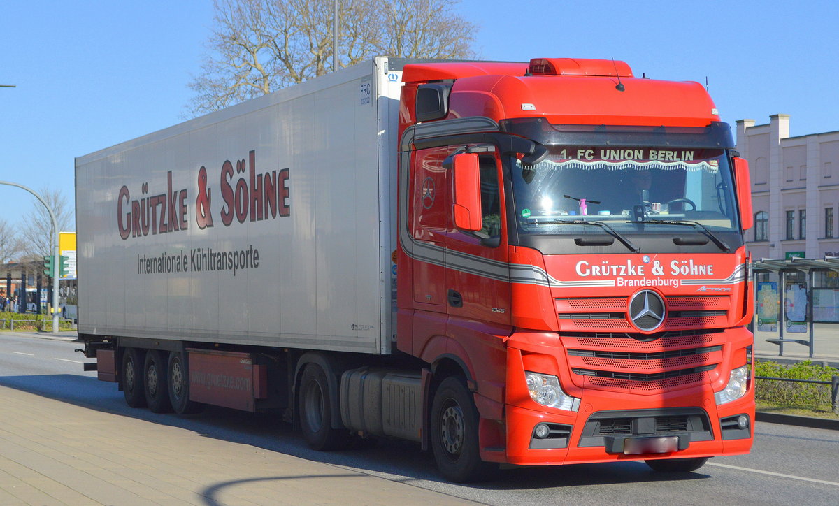 Die Firma Grützke & Söhne (Internationale Kühltransporte) mit Sattelzug und MB ACTROS 1845 Zugmaschine am 23.03.20 Brandenburg Hbf.