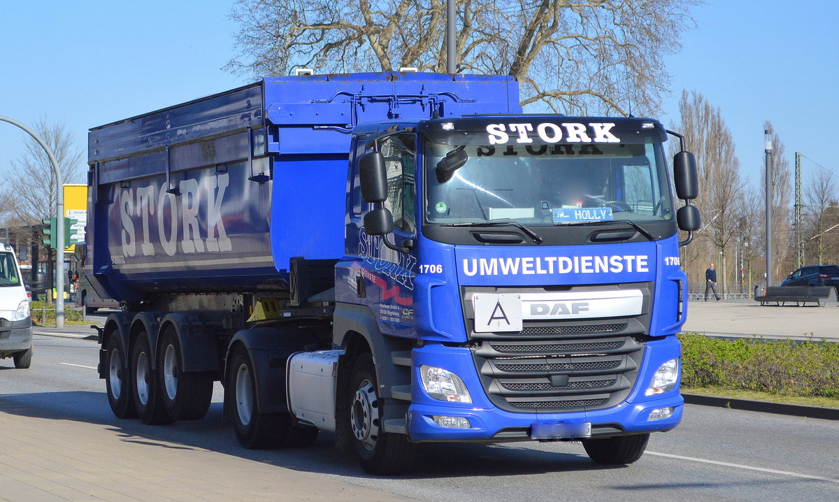 Die Firma STORK UMWELTDIENSTE mit einem hochwandigem Sattelkipper und einer DAF CF ??? PS EURO 6 Zugmaschine am 23.03.20 Brandenburg Hbf.