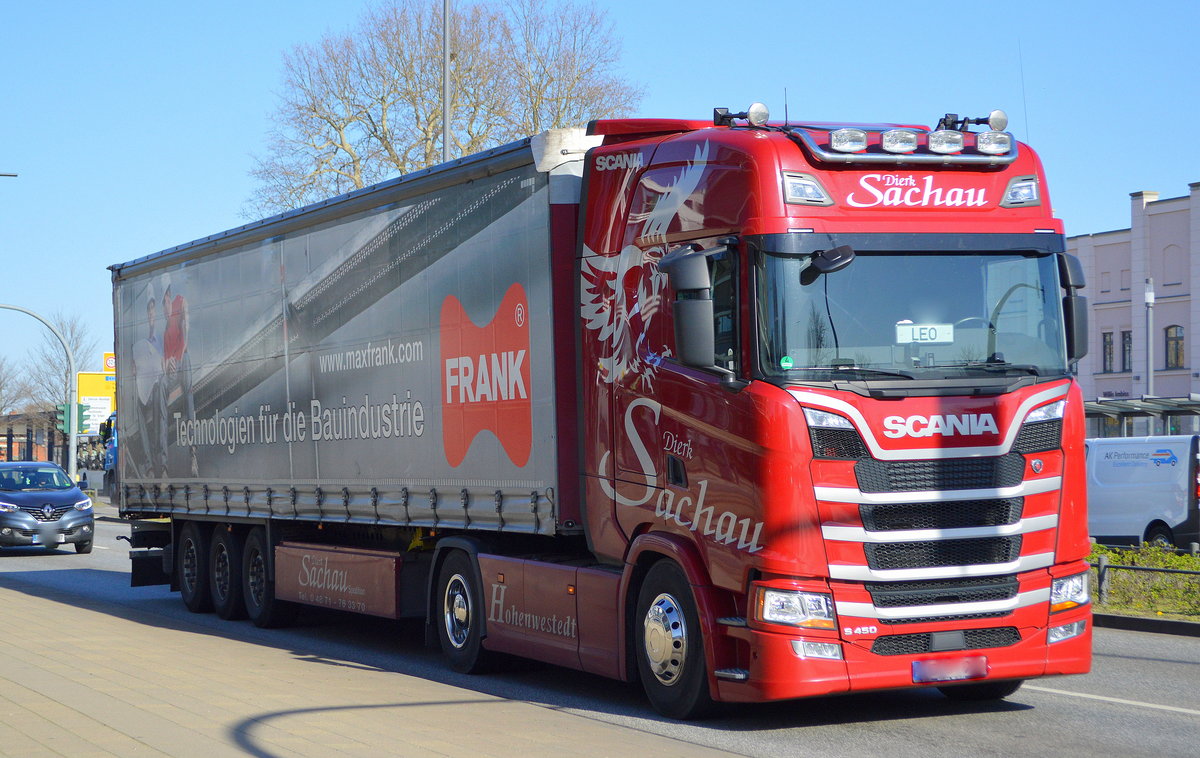 Ein Sattelzug von der Spedition Sachau, Inh. Dierk Sachau e.K. mit einer neuen SCANIA S 450 Zugmaschine am 23.03.20 Brandenburg Hbf.